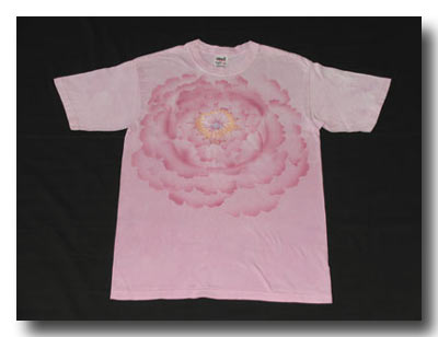 ピンクの生地に赤い染料でボタンの花を大きくデザインしたTシャツです。裏面は無地です。