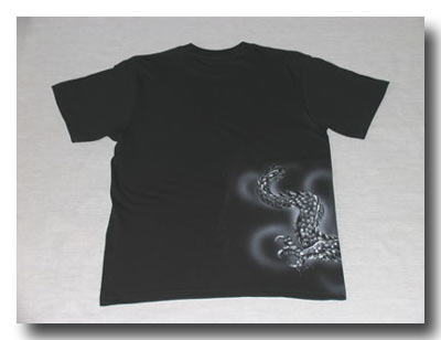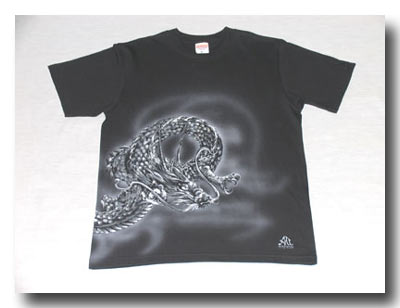 この製品は1枚1枚筆を使った手書き製品でで紺色の生地に白い染料で架空の生き物、龍を描いた躍動感のあふれるデザインのTシャツです。